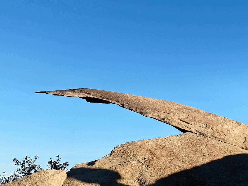 We tackled this famous hike between Poway and Ramona after camping at a different trailhead parking lot that night. We then had to drive 5 km / 3 mi to the to the shortest of three trails to the Chip. It was about 3 km / 2 mi pretty much uphill all the way there! Doug braved the jump onto the “chip” for the iconic photo, while Fran opted to stay on the main ledge (short legs and sloped rocks don’t mix!) and get a photo out front instead.