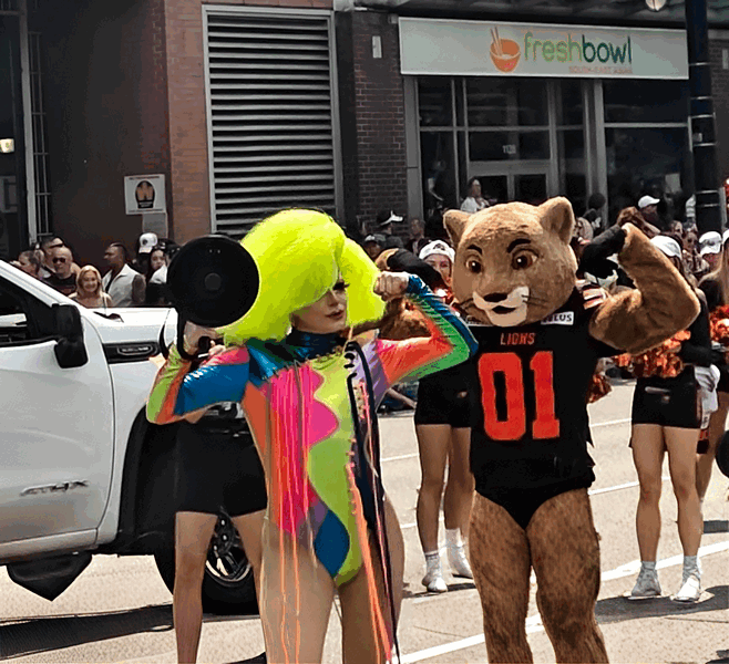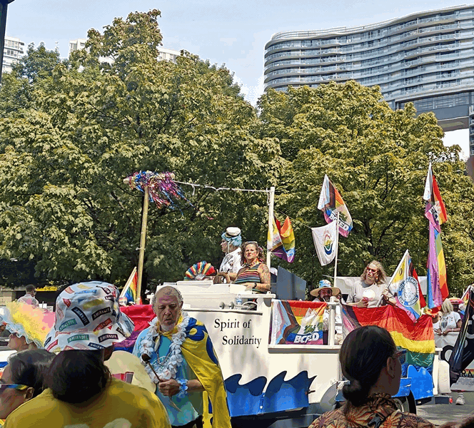 The next three weeks were mostly routine with a few occasions interspersed. Fran picked berries and apples a few times to make some fruit crisp. Sunday, the 3rd, in the afternoon we took the 240 bus into the city to see the Pride Parade – we’ve never been to one. We were not that impressed; it was mostly people marching in sponsored groups with the rainbow theme, disco music and some costumes. It was hard to find a good place to watch and more than 70% of the time the march stood still. We did take a few photos: