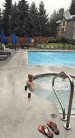 Saturday morning it was still raining and Doug passed on his long run till tomorrow. It wasn’t raining and it was brighter but the tops of the mountains continued to hide themselves. Since we don’t get much opportunities for hot tubbing, we decided to do that again before leaving. We went down about 8:30, discovered the pool area does not open until ten so we went returned to the room for tea/coffee and went back at 9:00 for about a half hour. We had to check out at 10 and by that time it was raining once again so no outings for us.