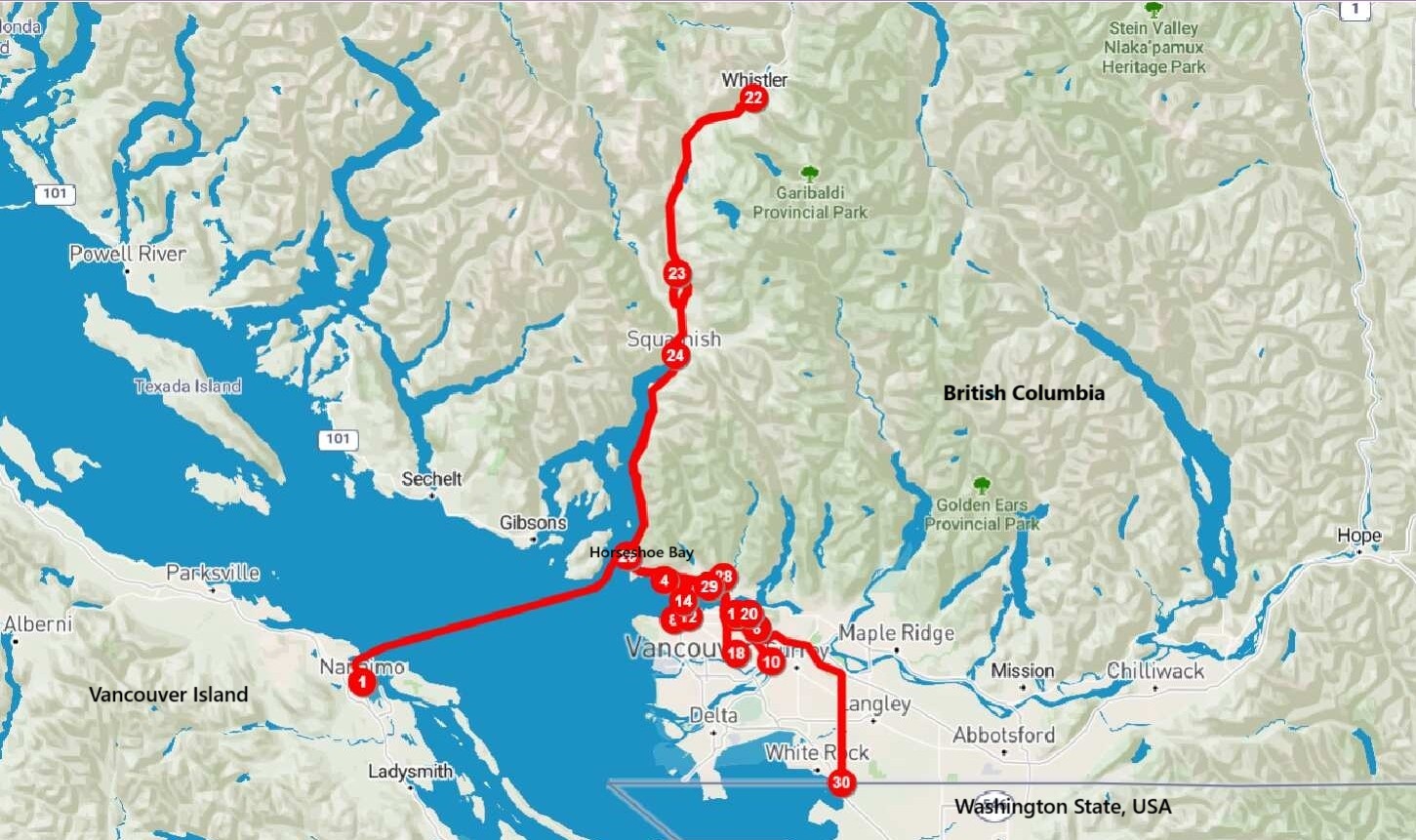 We got off the ferry at Horseshoe Bay and swung by Pat & Therese’s place to pick up the keys for Fran’s sister, Sandra’s, North Van apartment where we are staying for 8 nights and a parcel that had arrived. We got parked behind Sandra’s building, Doug hauled everything up to the third floor and Fran began to unpack while he went to the courier company’s office see if perhaps he could pick up his passport before they deliver tomorrow to Pat’s place but he was unable to do so.