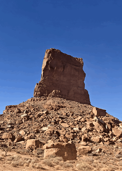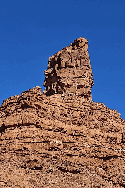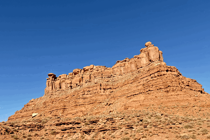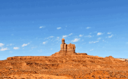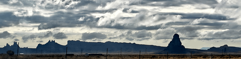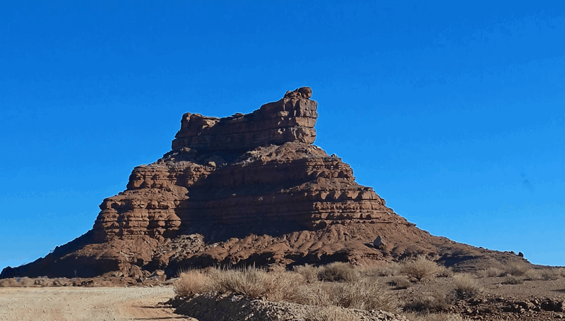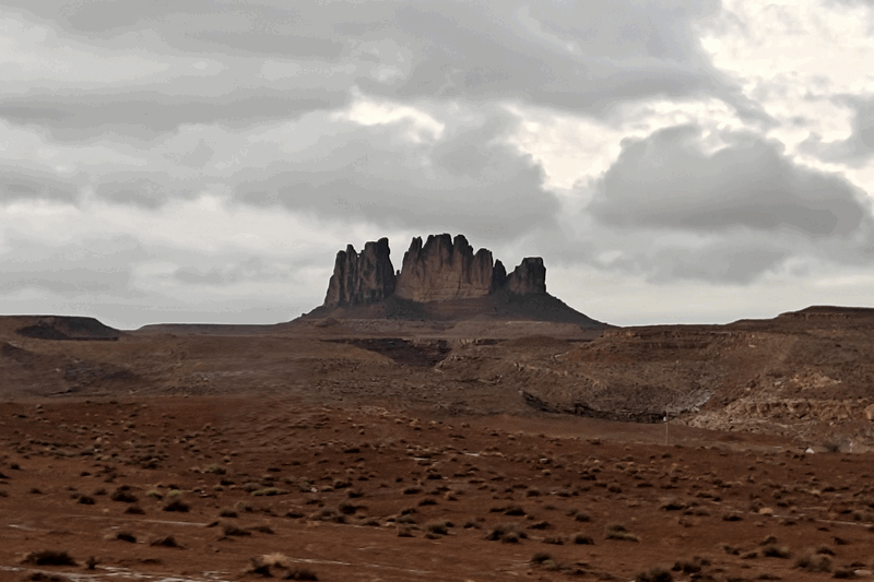 It was a warmer night than we’ve become accustomed too so the Fantastic Fan came out in the late afternoon and Fran used her fan for sleeping. Doug went out for his run and the rain started, on and off hard, and the sky remained cloudy. We left our camp spot passing Mexican Hat: (which we could actually see from our campsite in the distance last night)