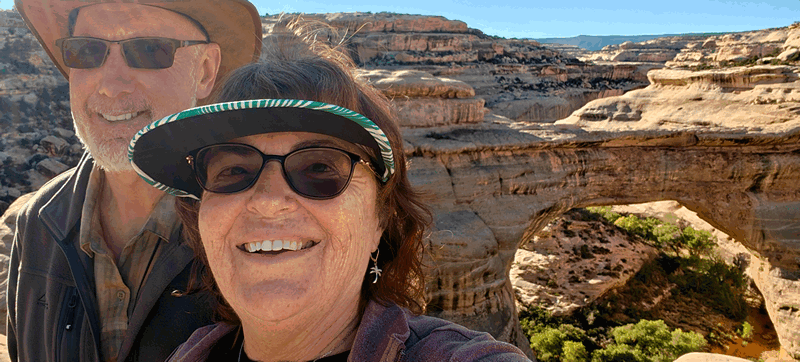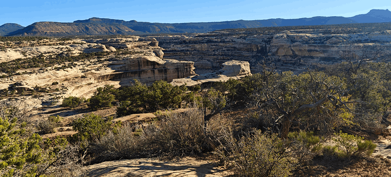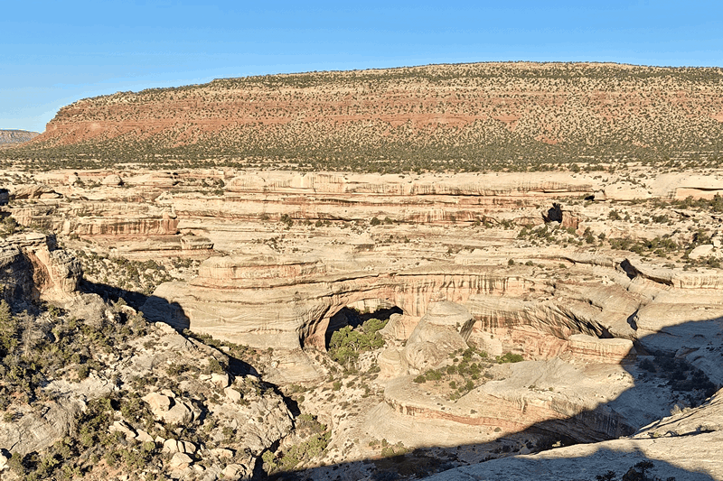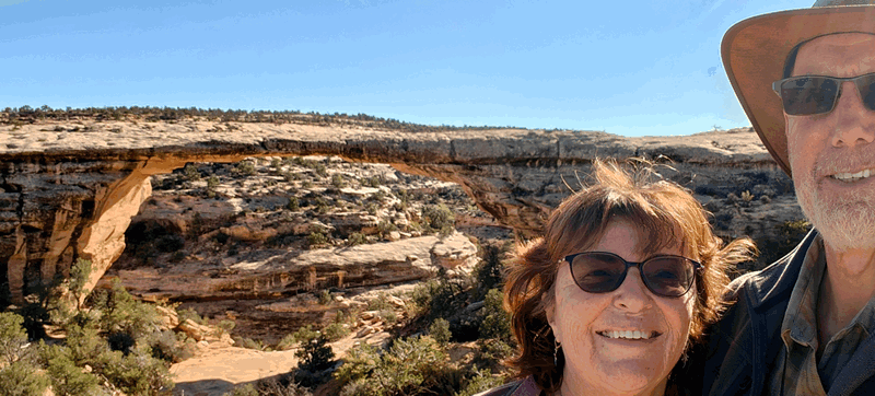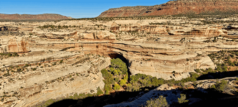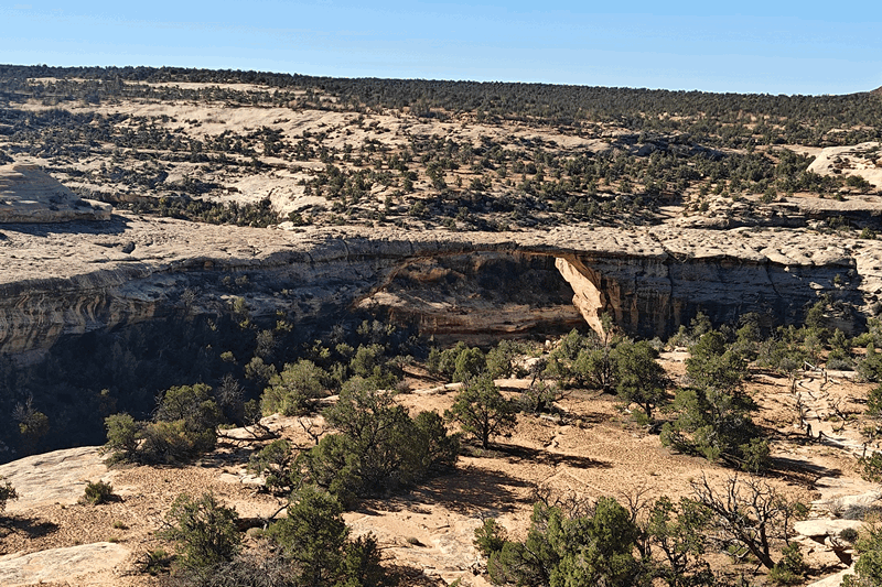 After morning exercise and tea/coffee the next day, we got in the truck and headed west (without the trailer) and went to visit Natural Bridges National Monument. This is open 24/7 regardless of the Government Shutdown so the only difference is the Visitor’s Centre will not be open. This was a 73 km / 45 mi drive on the mostly empty paved UT 95 highway.