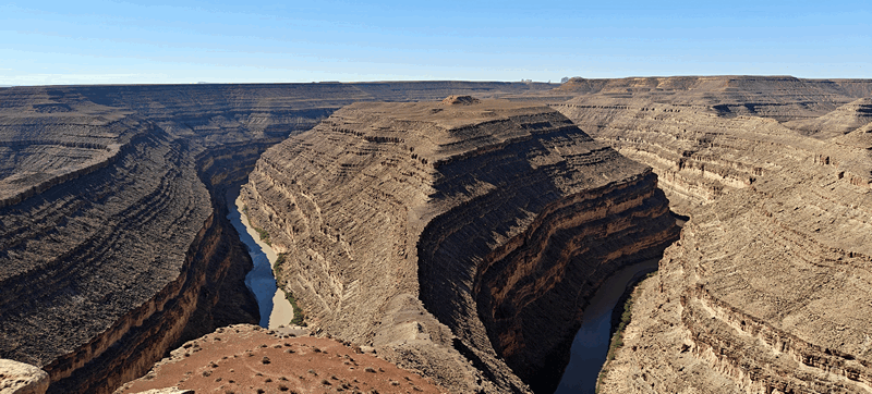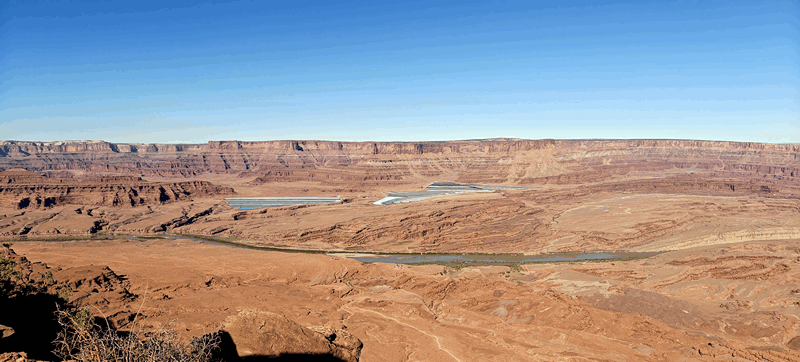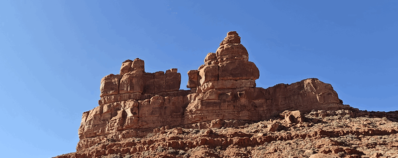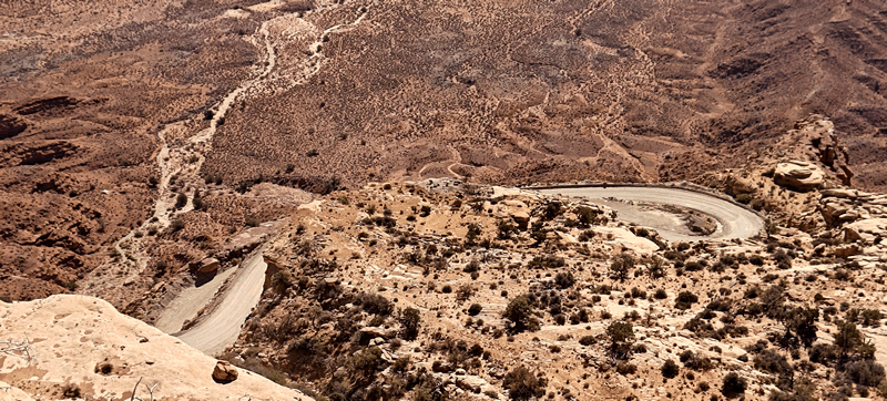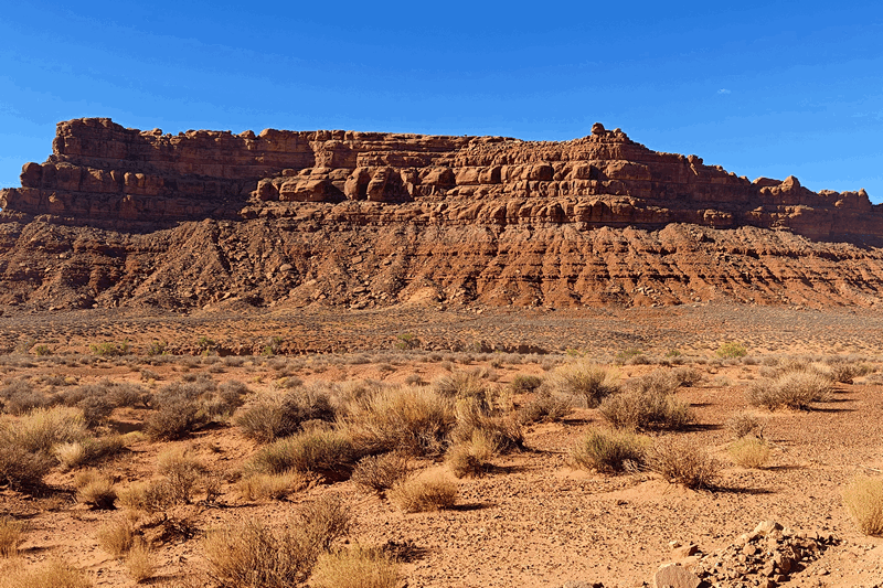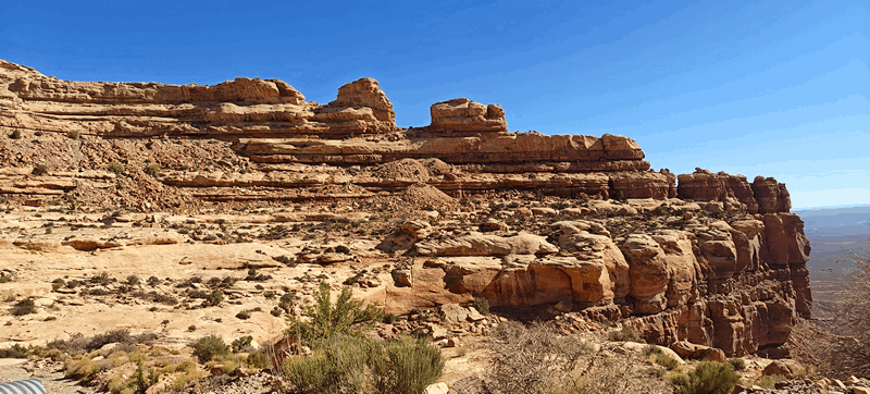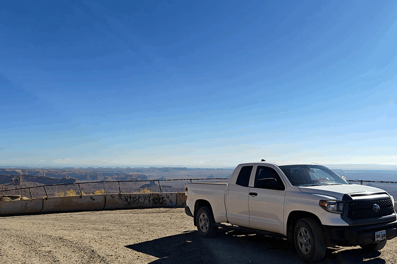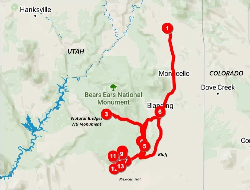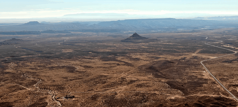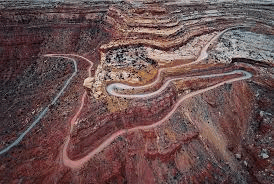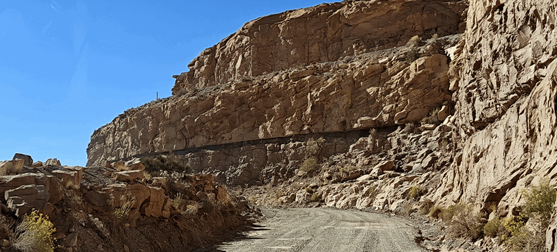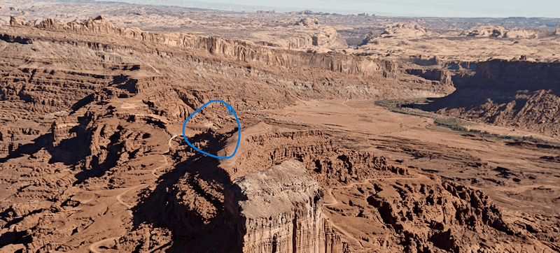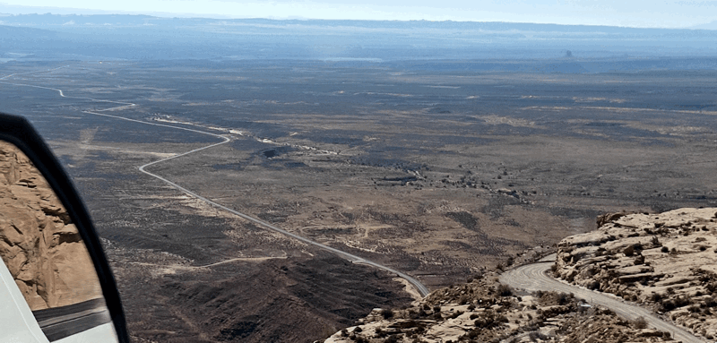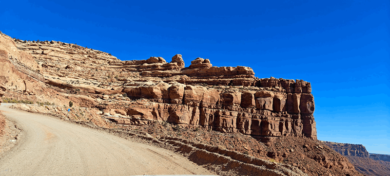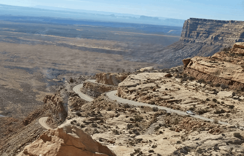 It was constructed in the 1950s by mining company, Texas Zinc, to move uranium ore from mines to a processing mill. It features: three miles of graded, unpaved, an 326 m / 1,100-foot climb with an 11% grade with no guardrails or paved sections. There are spectacular views of the Valley of the Gods and Monument Valley up the overlook. Here’s a view from above: