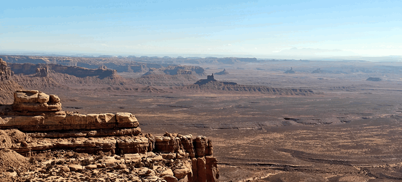 There were awesome views down into the Valley of Gods which were somewhat hazy due to the sun being on the wrong side but we took photos anyway:
