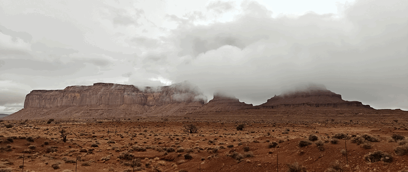 pics and crossed the state line back into Arizona (we left Arizona Sept 12th) passing by Monument Valley. Views were obscured by the low clouds but we still took some photos: