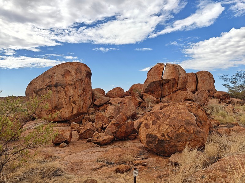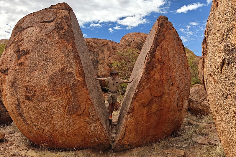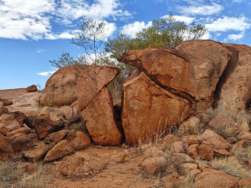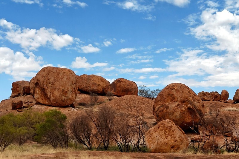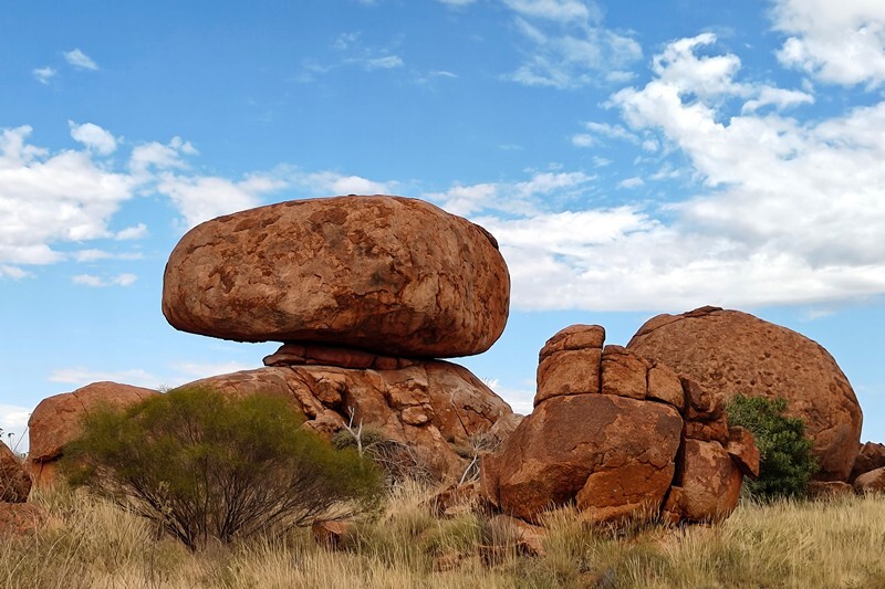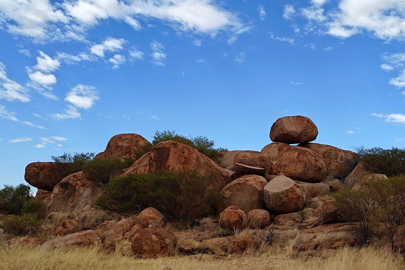 The Devils Marbles are large granite boulders that form the exposed top layer of an extensive and mostly underground granite formation. The natural processes of weathering and erosion have created the various shapes of the boulders. Some of the boulders are naturally but precariously balanced atop one another or on larger rock formations, while others have been split cleanly down the middle by natural forces. The boulders are situated in a wide and shallow desert valley, and are found in scattered groups mainly in the western side of the reserve. A short access road leads directly into the boulder fields from the Stuart Highway. Being one of the most widely recognized symbols of Australia’s outback, the Devils Marbles are also one of the most visited reserves/places in the Northern Territory.