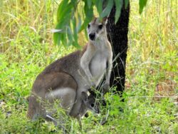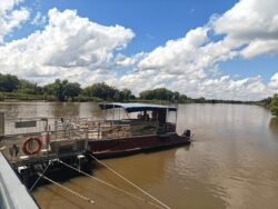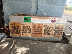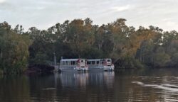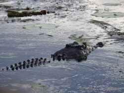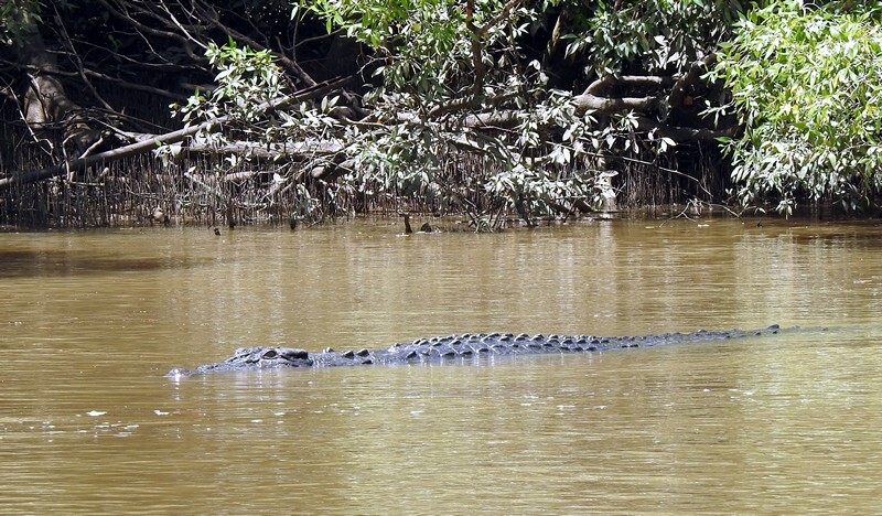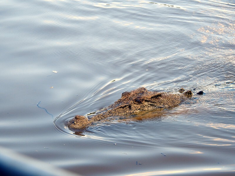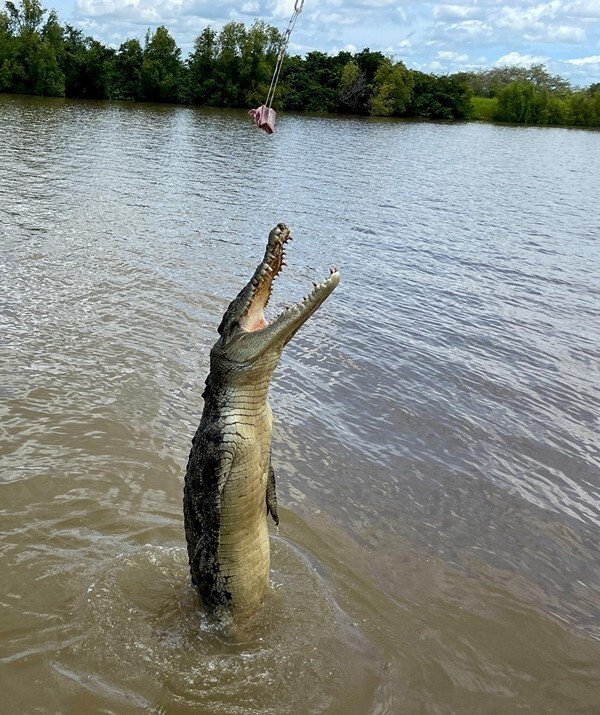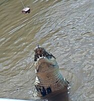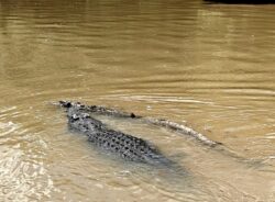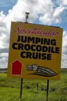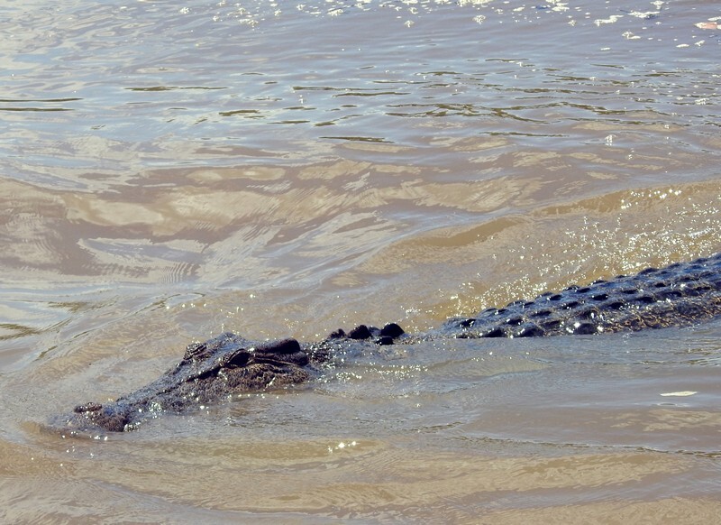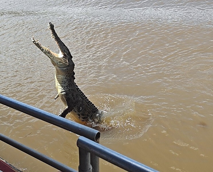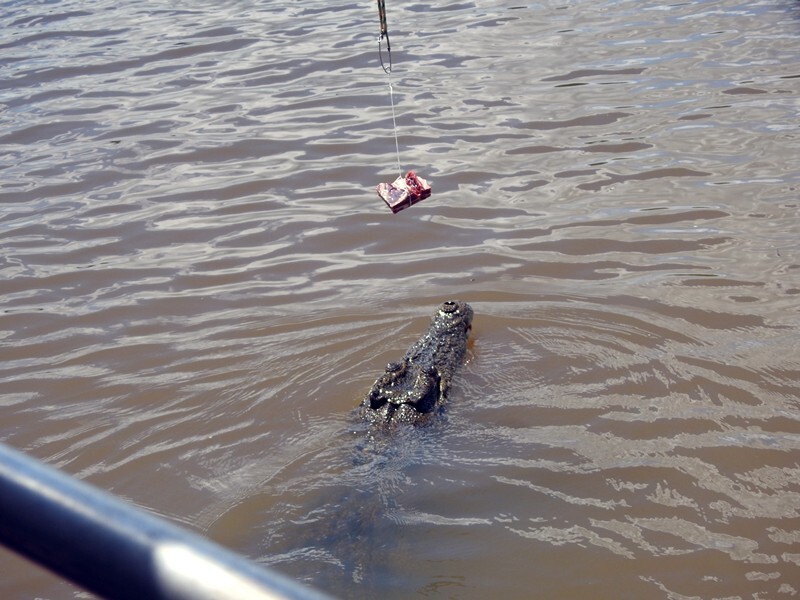 So Thursday morning after Doug’s run and our showers (Fran did not feel up to exercising) we made our way out of Darwin. Doug had made us a reservation yesterday for the “Spectacular Jumping Crocodile” Boat Tour for 11 today so we made our way there and arrived nearly an hour early. At 11 about a dozen of us boarded the boat for a one hour tour. We saw a total of about nine crocodiles. There was a fellow on board who would dangle a hunk of water buffalo meat to try and get them to jump, which by the way is a natural behaviour and not one learned from these boat ventures.